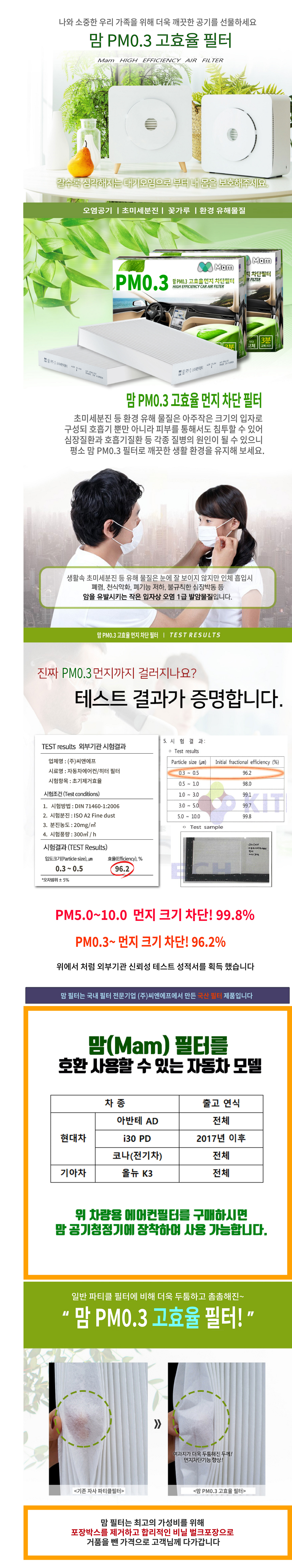 초프리미엄 맘(Mam) 헤파 필터는 포집이 가장 어려운 PM 0.3µm의 극초미세먼지를 99.97%까지 차단해 줍니다. 최초 HEPA H13을 적용하였으며, 천연 녹차 추출물 카테킨이 함유된 프리 필터가 항균, 항알러지 효과 친환경 첨착활성탄 콜게이트 필터로 악취 및 유해 가스까지 완벽하게 잡아 줍니다.